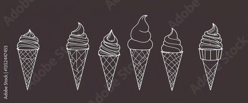 Illustrationen von verschiedenen Eistüten auf schwarzem Hintergrund, ideal für Eiscreme-Designs und sommerliche Hintergründe