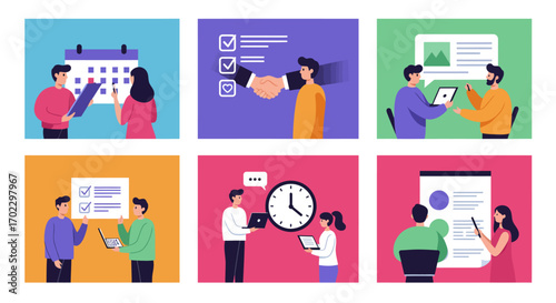 Illustrations depicting business activities such as scheduling, negotiation, communication, planning, time management, and presentation.