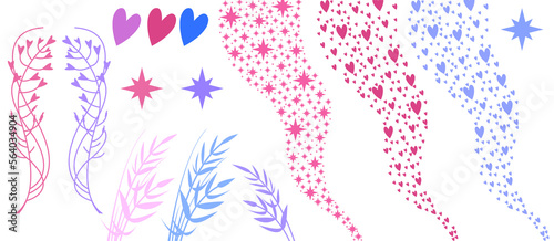 Illustrations of floral and graphic ornaments on a transparent background png. Stars, hearts, leaves. Isolated, clipart, cartoon