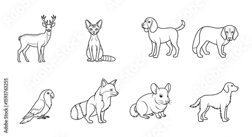 Illustrations of various animals including a deer, cat, dogs, parrot, fox and chinchilla line art