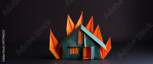 illustrative depiction of a house made of paper that is in flames and fire has broken out