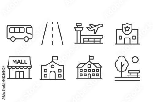 Illustrative icons depicting transportation modes, facilities, and urban landscapes in a modern setting