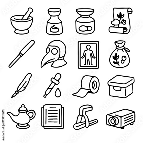 Illustrative image: a series of medical or apothecary-themed line drawings. The images evoke the practices of old, including tools, jars, bottles, and other associated items.