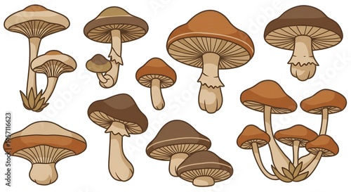 Illustrative Mushroom Variety on White Background, Perfect for Culinary Education