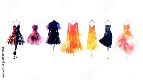 Illustrative watercolor dresses showcase whimsical designs on transparent backdrop