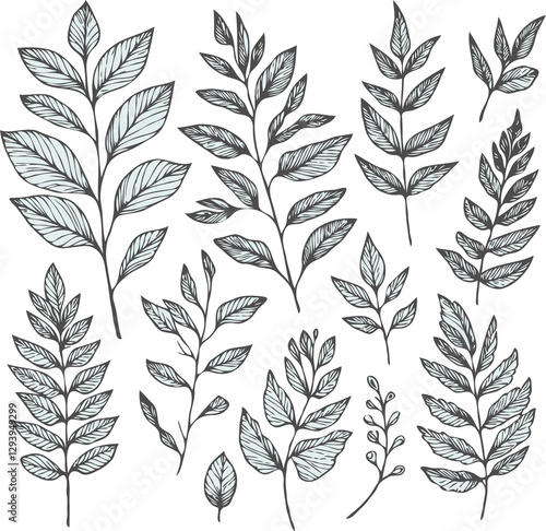 Illustrator Artwork Hand Drawn Vintage Sketch Drawing, green leaves Line Art, Plants Collection branches Floral elements, set of Botanical Illustration Outline leaf, branch Black And White leaves