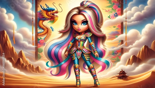 Ilustración 3D Reina Heroína, gladiadora, dragón, estilo, chibi, animé, manga, kawaii, dibujos animados,