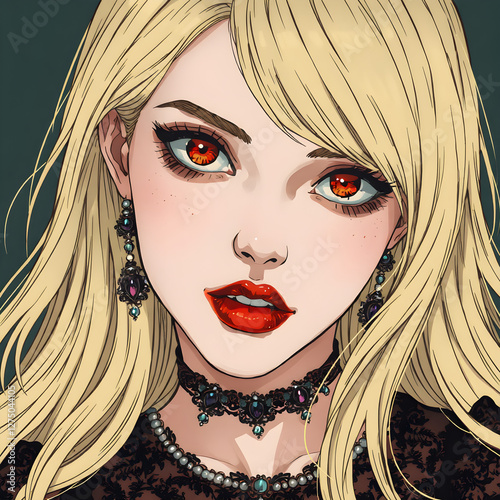 Ilustración detallada de una vampira rubia con un vestido gótico y una mirada hipnótica