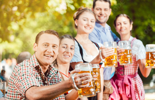 Im Biergarten - Freunde in Lederhosen und Dirndl trinken eine frische Maß Bier