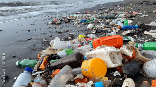 image depicts polluted beach littered with various types of plastic waste, highlighting environmental crisis caused by human activity. scene evokes sense of urgency to address pollution and protect m
