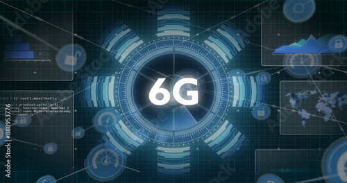 Image of 6g text, network of connections with icons and data processing