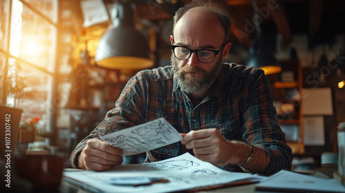 Image of a designer sitting working in a coffee shop, wearing glasses and holding a pen and sketchbook. The surrounding atmosphere is full of creativity and relaxation.
