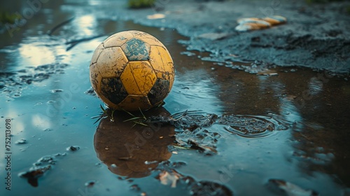 Image of a forgotten soccer ball in a murky puddle.