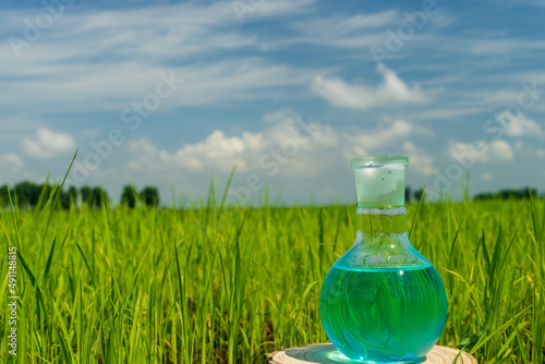 Image of a glass flask with a chemical solution on the background of young rice shoots. Glass bulb. Agrochemical solution. Chemical agent. Fertilizer. Plant protection.