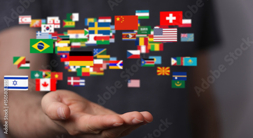 Image of a hand holding various national flags, symbolizing global unity and international relations.