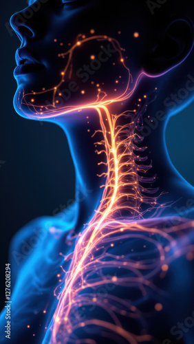 Image of a human head with highlighted neck area showing VNS, or vagus nerve stimulation.