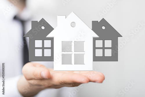 Image of a real estate agent's hand holding three house icons, symbolizing homeownership and property investment.