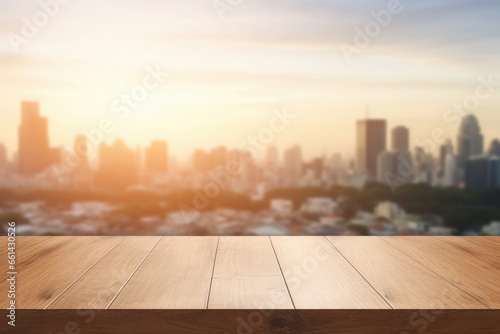 image of a wooden table on an abstract blurred background. texture of the city landscape. place for text. dawn or dusk.