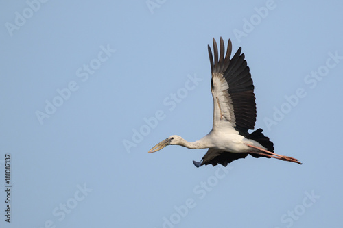 Image of an Asian openbill stork(Anastomus oscitans) flying in the sky. Bird, Wild Animals.