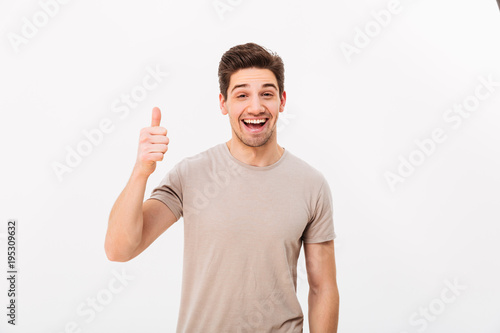 Image of attractive man 30s having stubble showing thumb up on camera with happy smile, isolated over white background