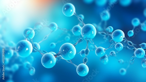 Image of blue molecule atoms floating on blue liquid serum background. Science and medicine concept.