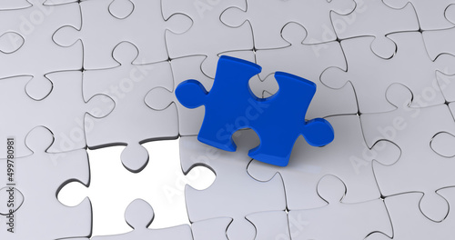 Image of blue piece of puzzle over multiple gray puzzle