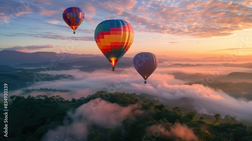 Image of colorful hot air balloons flying over the mountains. beautiful sky background
