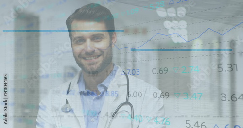 Image of data processing and statistics over male doctor with stethoscope