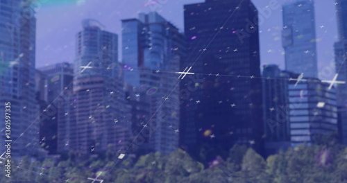 Image of data processing over grid and cityscape