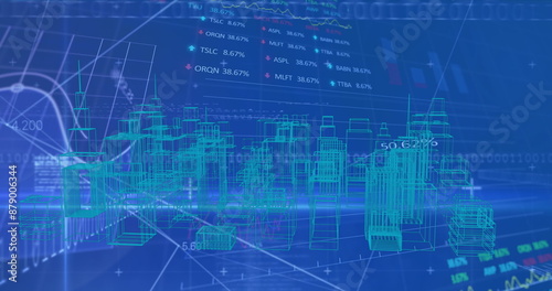 Image of digital city over data processing on blue background