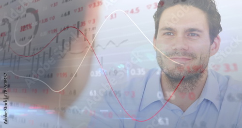 Image of financial data processing over diverse businesspeople shaking hands