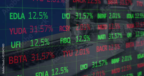 Image of financial data processing over laptop and payment terminal