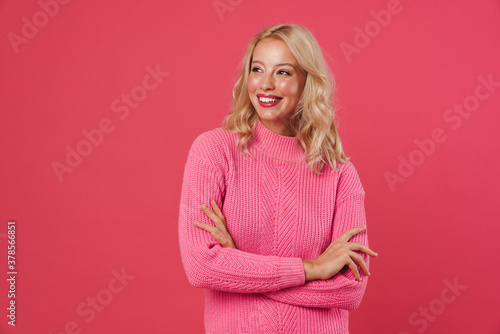 Image of happy blonde woman smiling and looking aside