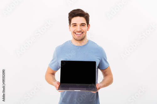 Image of happy smiling man with bristle holding silver notebook demonstrating or advertising copyspace screen, isolated over white background