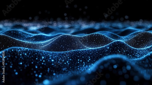 Image of horizontal lines of blue particles and undulating 3d landscape on black background. with generative ai
