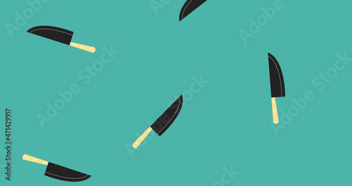 Image of illustration of black and cream kitchen knives falling on blue background