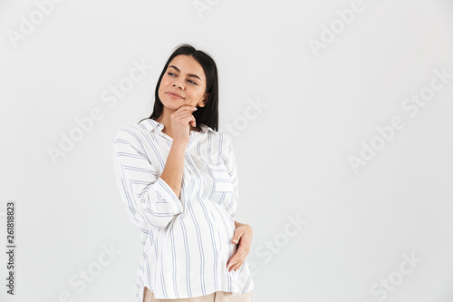 Image of pleased pregnant woman 30s smiling and touching her big tummy