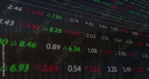 Image of scope scanning with computer icon over stock market on black background