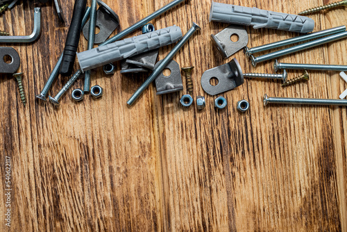 image of sets of plastic dowels shiny metal self-tapping screws in pile on table background.