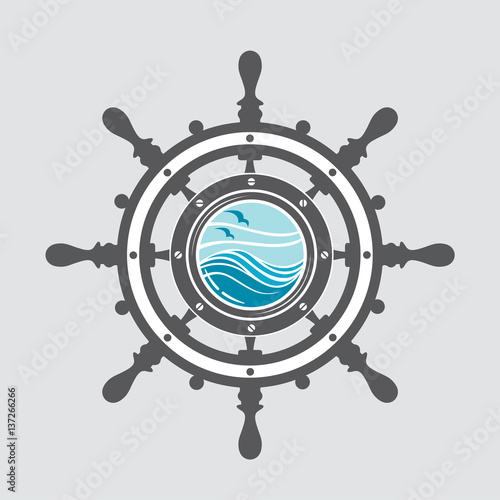 image of ship helm and porthole with sea waves