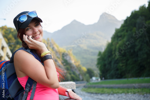Image of smiling brunette tourist talking on phone