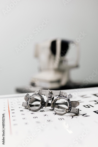 Image of test glasses with letter diagram for eye examination, vision optometry background. Vision diagnostics and prevention concept.