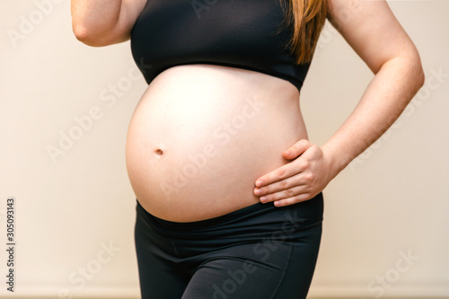 Image of the stomach of pregnant woman at last ninth month in the top and leggings, arms hugging her stomach. Pleasant expectation baby