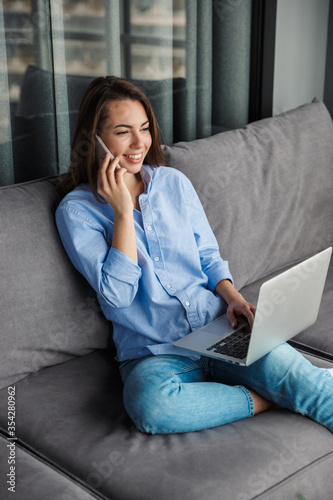 Image of woman talking on mobile phone and using laptop while sitting