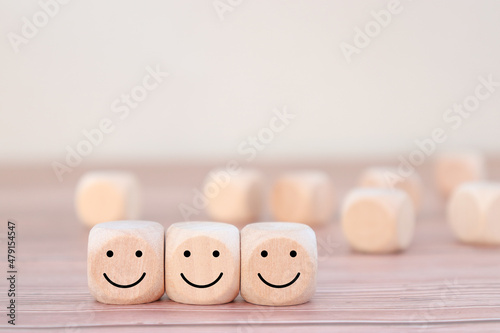 image of wooden blocks with smiling faces icons over table ,building a strong team, human resources and management concept.