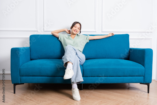 image of young Asian girl sitting on sofa at home