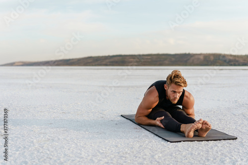 Image of young athletic sportsman doing exercise while working out