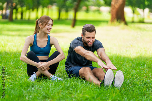 Image of young smiling couple, woman training with man or bearded coach trainer, doing stretching exercise, before morning jogging, outdoors. Fitness, workout, healthy lifestyle concept.