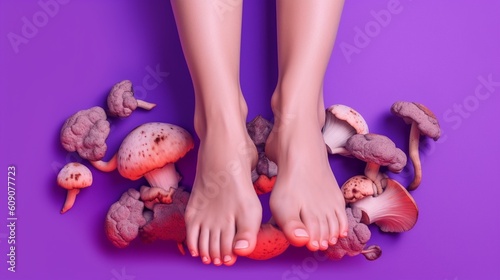 image with female bare legs, feet with mushrooms between fingers. health care. foot fungus. AI generative
