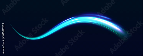 Image with the effect of high-speed movement on the road, green stripes on a dark background. Light trail wave, fire path trace line, car lights, optic fiber and incandescence curve twirl.